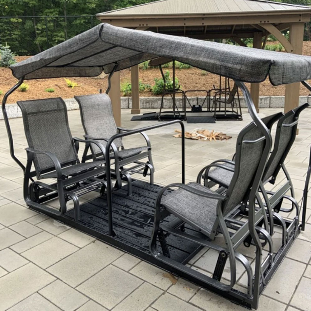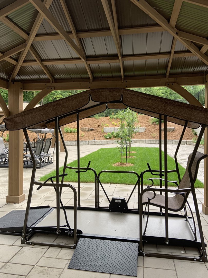 Balançoire avec 4 chaises autobloquantes qui se bercent indépendamment. Accès facile grâce au seuil et à la barre centrale. Le bercement se déclenche uniquement lorsque quelqu’un s’assoit.